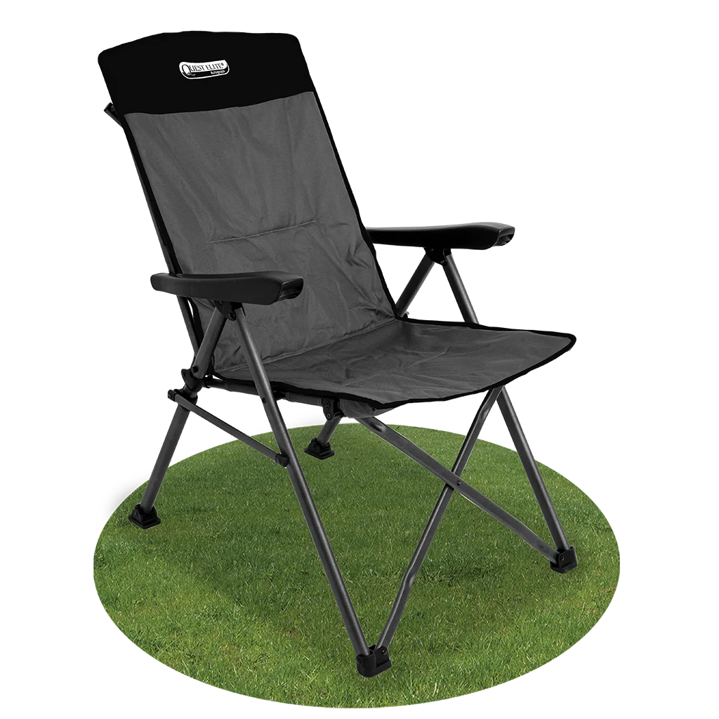 This is the premium Quest Elite Cumbria chair. This is a recliner chair that packs away into a small size and comes with its own carry bag. It features the excellent quilted Q-tex weave fabric and the premium electro plated frame. The frame includes a safety lock to ensure the chair is locked in position when in use. The seat is extra wide giving you additional space and comfort and the high back gives you additional support. The chair reclines as well giving you additional comfort and allows you to get just the right position every time. The chair also has hard arms for additional support making it easier to use and more comfortable. It comes complete with a carry bag making it extremely easy to store away and carry when not in use.