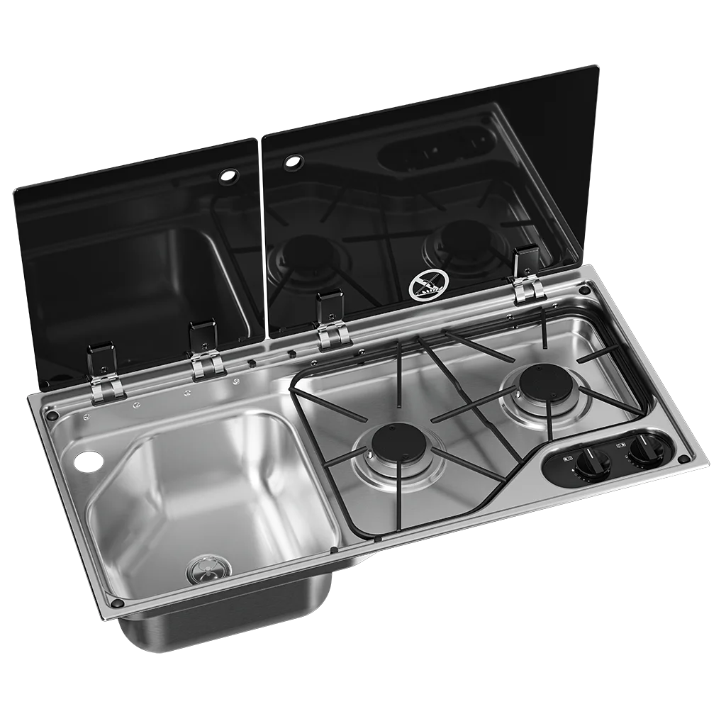 The Dometic Vision Combination Unit is the ultimate kitchen solution for compact spaces like motorhomes, caravans, and campervans. This sleek two-in-one unit combines a high-efficiency two-burner gas hob and a practical sink, available in both left-hand and right-hand sink configurations to suit your layout. Its engineered for maximum space efficiency, perfect for mobile kitchens.