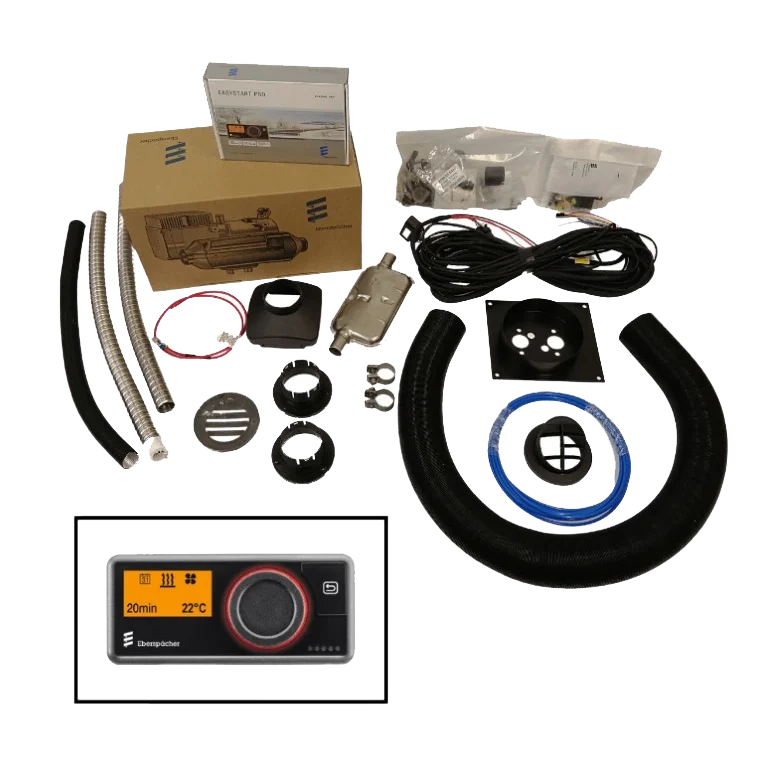 This kit contains: Eberspacher AS3 D2L Heater, Mount bracket for internal installation, EasyStart Pro controller, Wiring loom for battery, Fuel pipe with tank pick up, 1 metre exhaust, Ducting and associated fittings included, 1x hot air outlet.