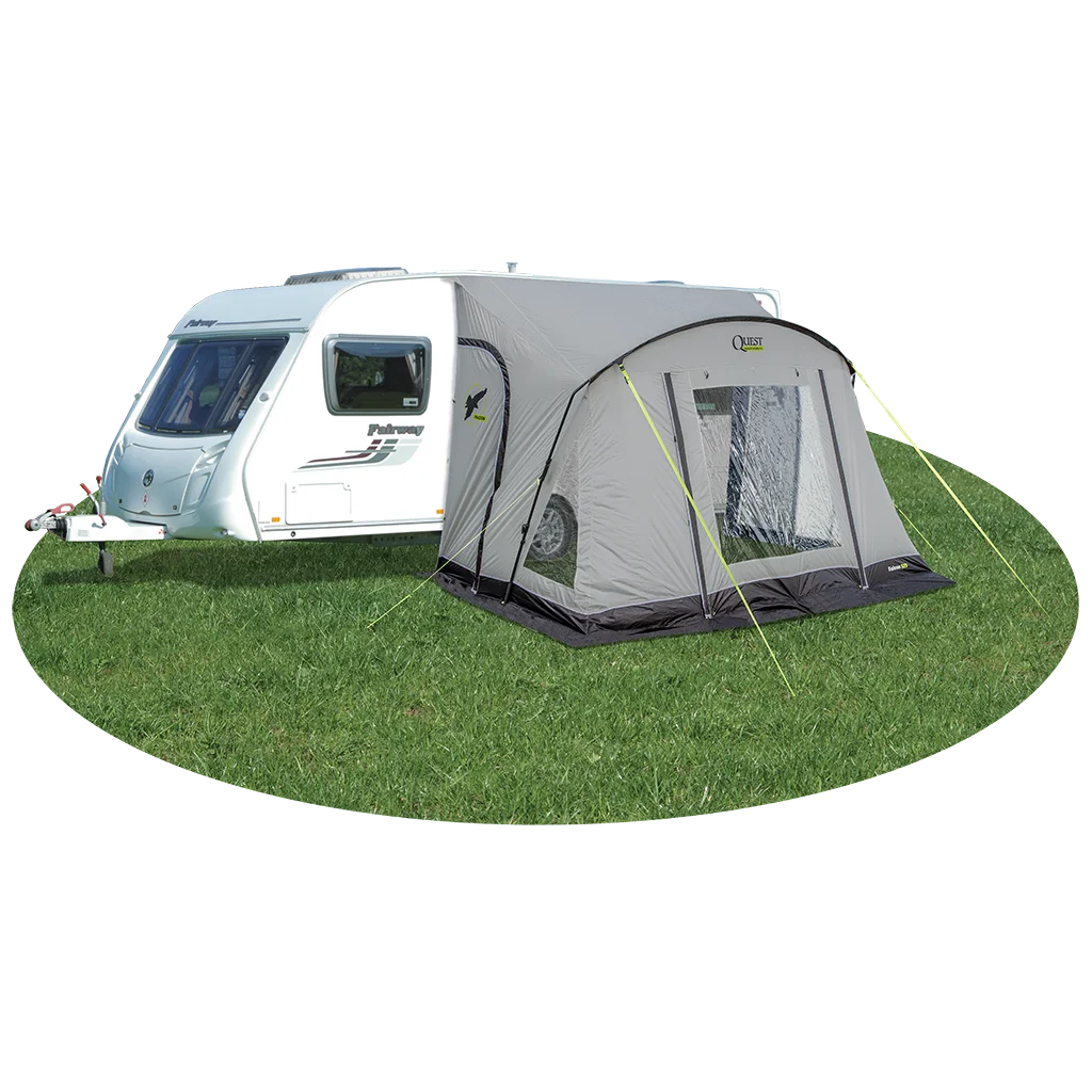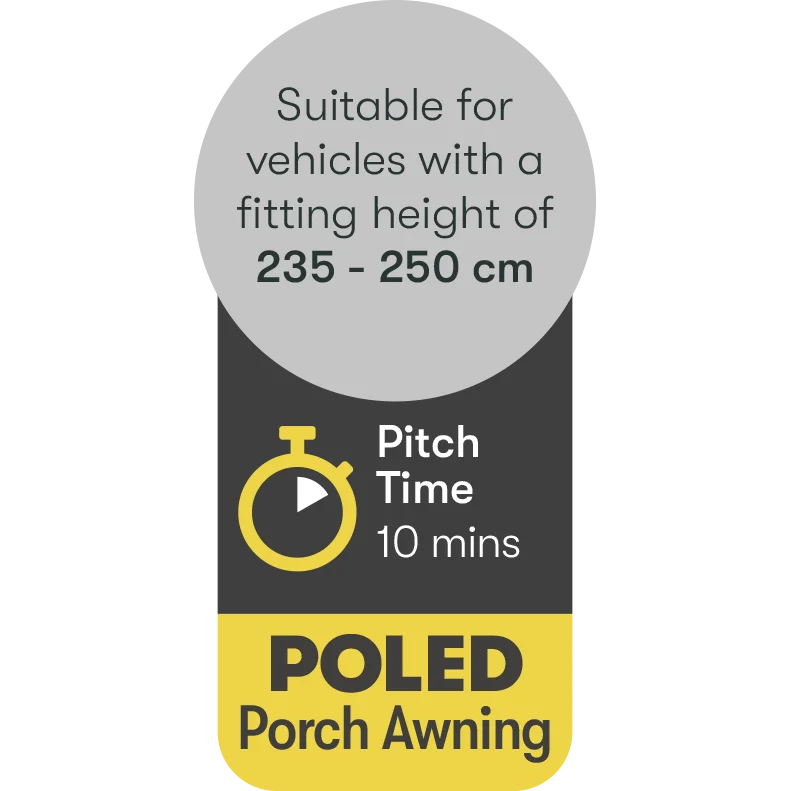 The awning is all about ease of use and value. It features an easy to use, minimal quick-fit pole system. This pole system is quick to put together, lightweight and adjustable to help ensure the best pitching even on uneven ground. The pitching is easy enough to be done by a single person if required. It uses the modern Quest Tec 75 fabric which is lightweight, quick drying and extremely waterproof making the awning easier to use and maintain. It is U.V. coated to help protect it from the harmful UV rays which helps extend its lifespan and gives you a U.P.F. rating of 50+ which is the highest possible giving you complete protection.