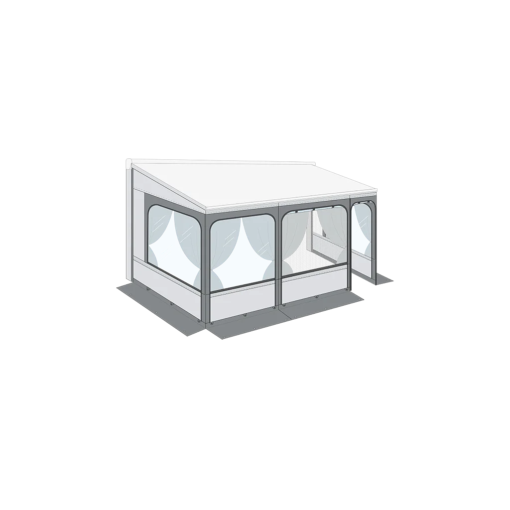 Connection System: Panels attach to awning fabric via Fast Clip internal lever hooks. Panels zip together for secure enclosure.