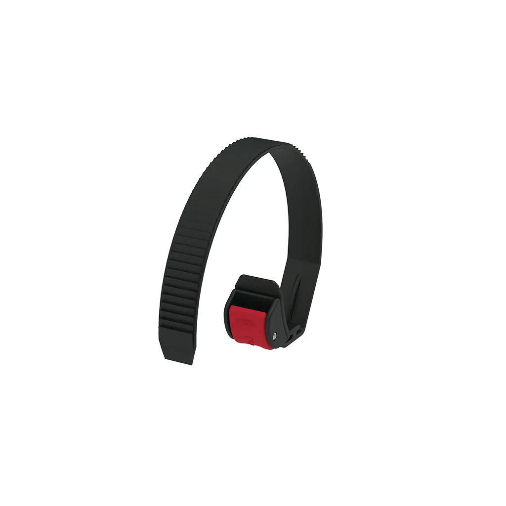A strap that attaches to the rail of a Fiamma bike rack to secure the bicycle wheel during transport. Specifically designed to fit Fiamma reinforced rails, such as the Rail Quick Pro models.