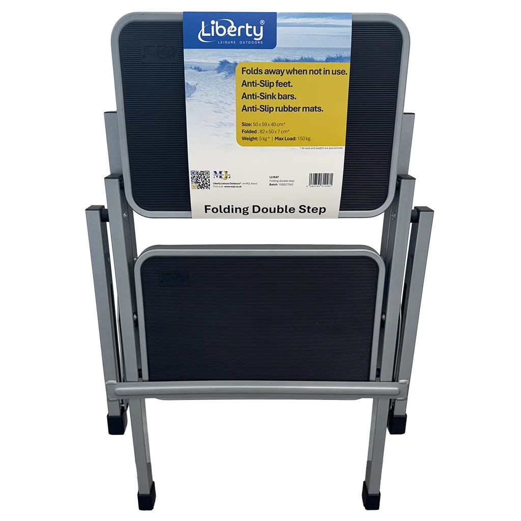 Make access to your caravan, motorhome, or camping setup safer and more convenient with the Liberty Folding Double Step. Designed with durability and practicality in mind, this high-quality step provides a stable platform whether you’re stepping into your vehicle or reaching elevated areas outdoors.Built to meet EN14183:2003 safety standards, it offers peace of mind alongside everyday usability. The foldable design ensures it packs away easily, making it perfect for travel and compact storage.