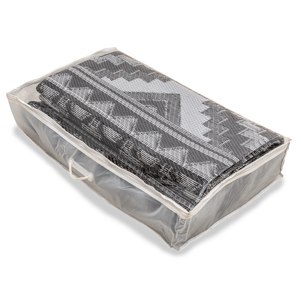 The construction means it is durable but also breathable so the underlying grass is not killed when used outdoors. It is water repellent and drys quickly, but it does not rot, so it can be sued in the dry or wet. The thick nature of the matting and air gaps gives it a padded more comfortable feel than plain reed matting. It is complete with pegging loops on the corners allowing you to anchor it to the ground.