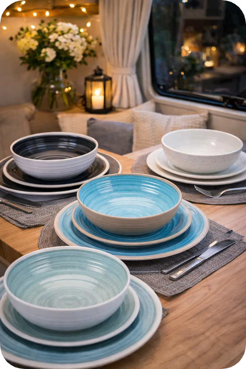 A robust and sustainable 12-piece dinnerware set manufactured from 100% recycled PET (rPET) plastic. Designed for retailers and trade customers seeking eco-conscious alternatives for the home, leisure, and outdoor dining markets. Each set includes 4 dinner plates, 4 salad plates, and 4 bowls, and is available in four colour variants to suit a range of consumer preferences. Ideal for camping, caravanning, picnics, garden dining, and everyday home use.