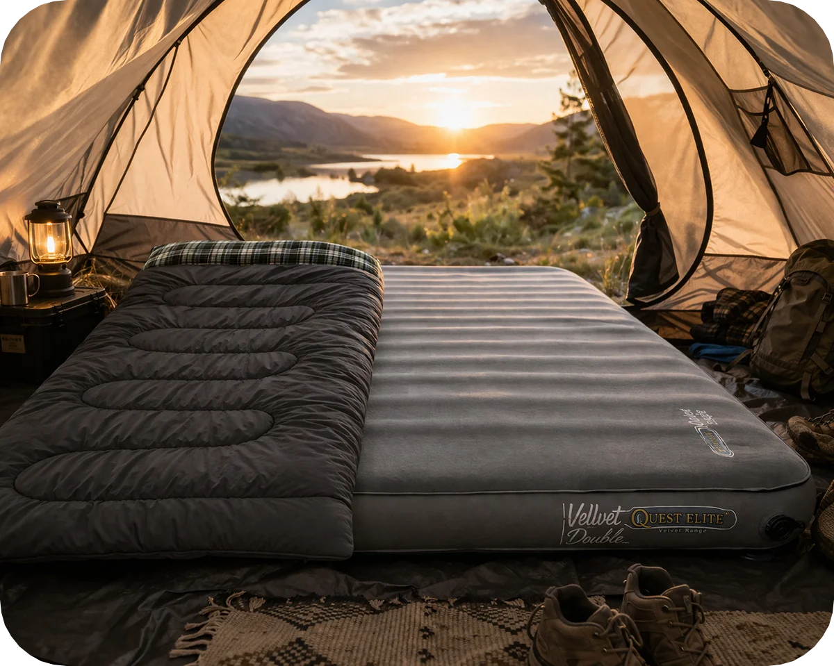 Quest Elite Velvet 15 Double Self-Inflating MattressSleep in comfort wherever your adventures take you with the Quest Elite Velvet 15 Double Self-Inflating Mattress. Designed for outdoor enthusiasts, festival-goers, and home use alike, this mattress blends luxury, durability, and portability for the ultimate sleeping experience.