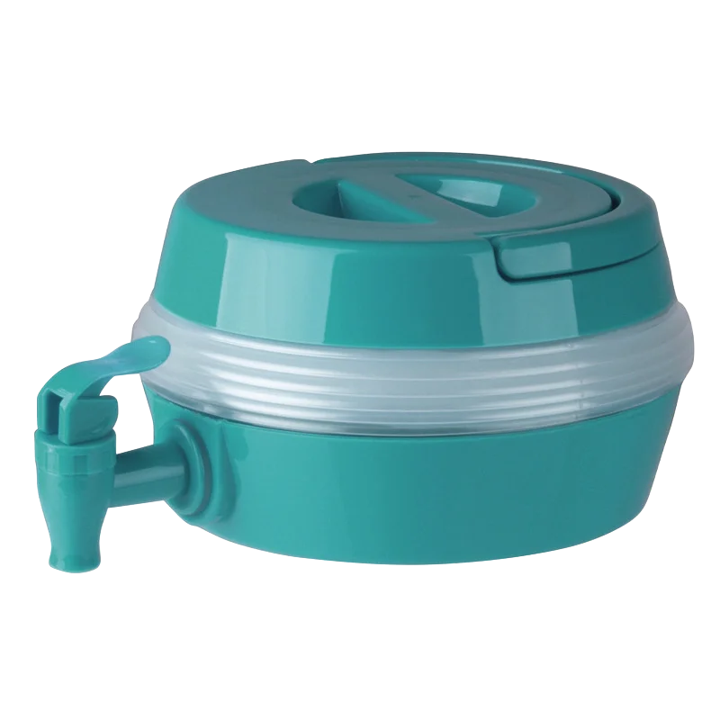 5.5 litre concertina water carrier with rigid top and bottom. comes complete with on/off tap. complete top unscrews to give large opening for easy filling. ø20 x h25/11cm.