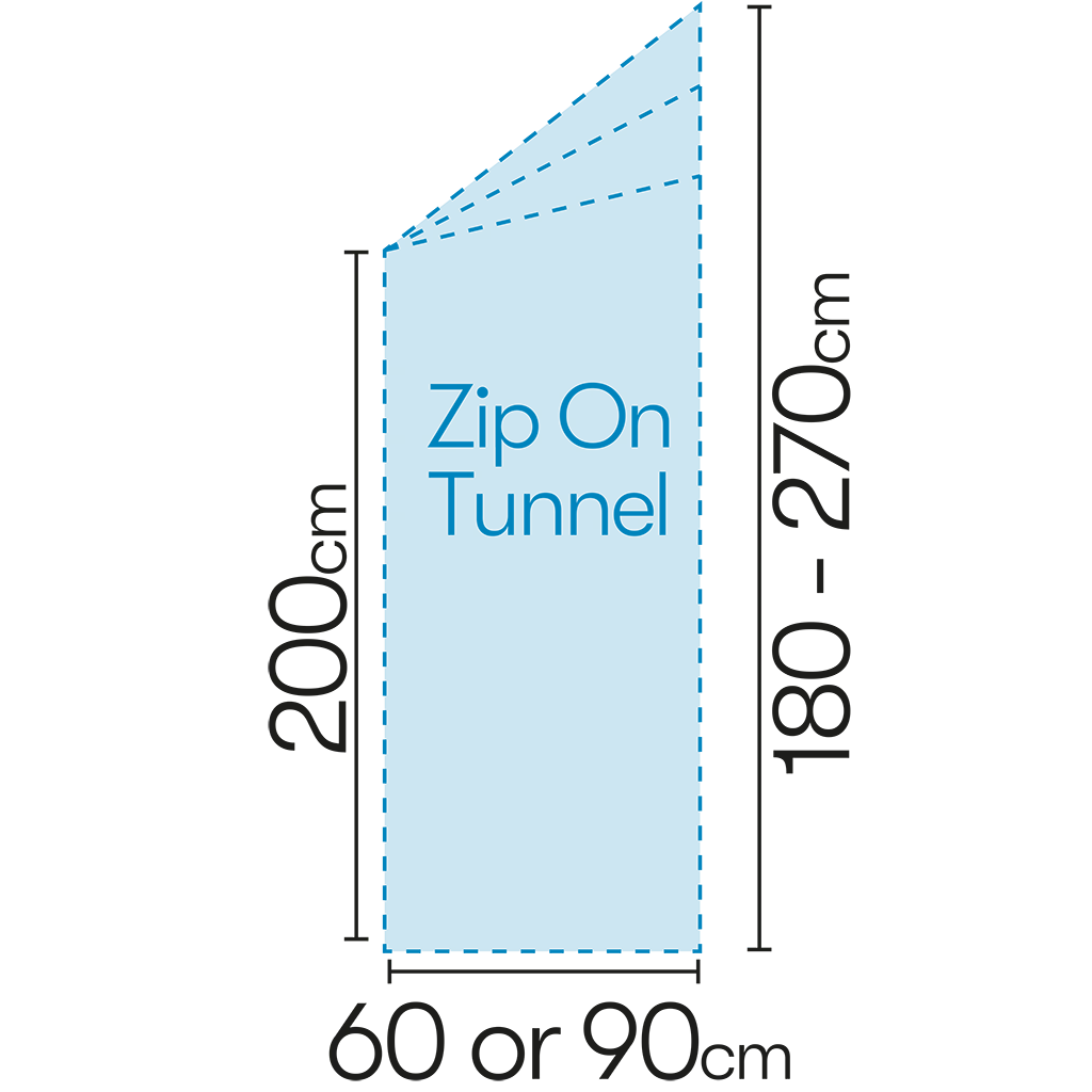 This is the premium quality, zip in low vehicle connector for the Triton drive away awning. It allows you to connect your Triton drive away awning to vehicles between 240 and 270 cm high.