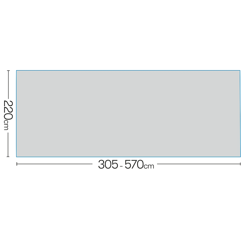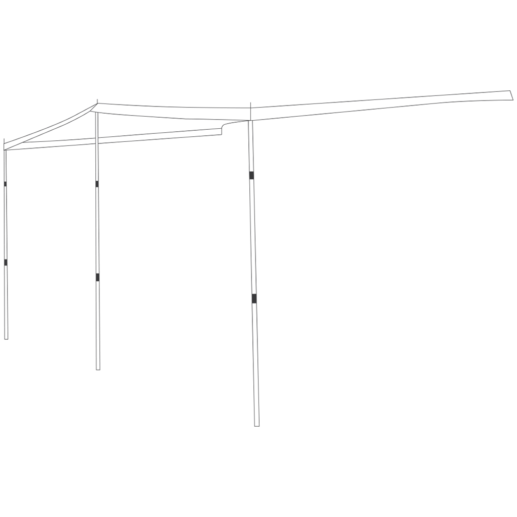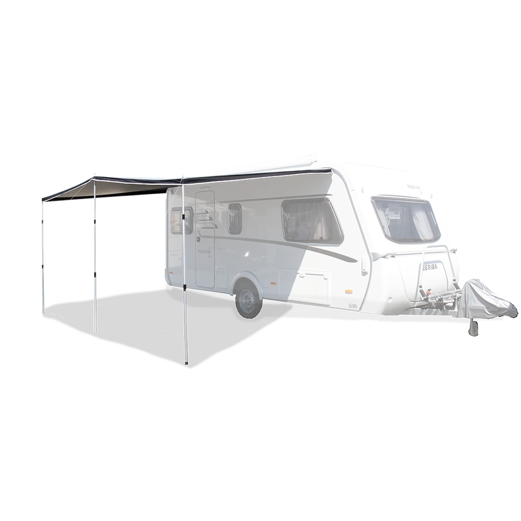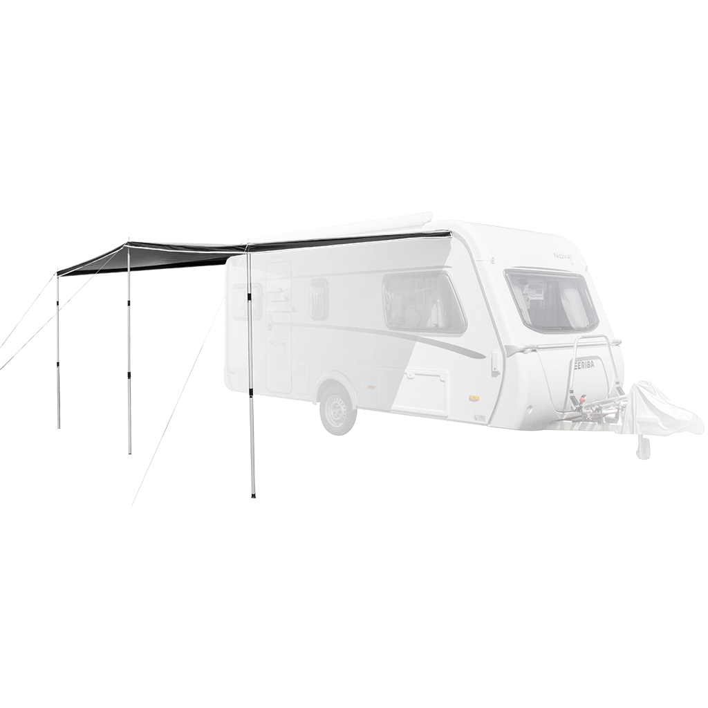This is a premium sun canopy called the Sun Shady Pro. It can be used stand alone by sliding directly into the awning rail on your vehicle, or can be attached to your awning (depends upon year of manufacturer). Made in Germany it is produced to the very highest standards and features the luxury HydroTech Cotton Touch fabric. It comes with three telescopic poles and guy lines which means it is simplicity itself to erect, so much so it can easily be done by a single person in a matter of minutes. This is the 470 cm wide version of the canopy and is made to fit the Galaxy, Pluto size 8 and Ceres 9 awnings.