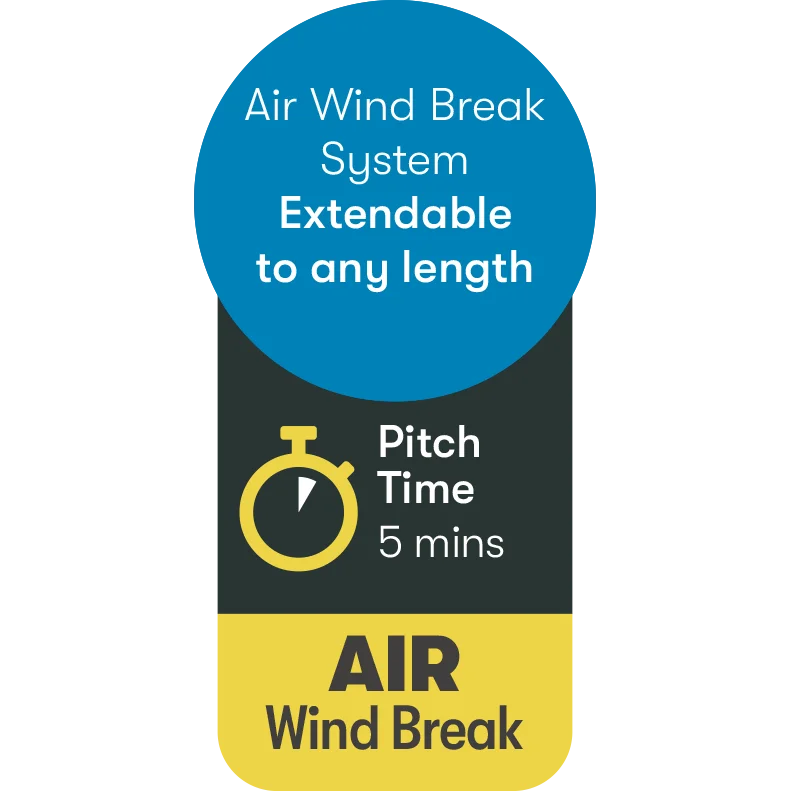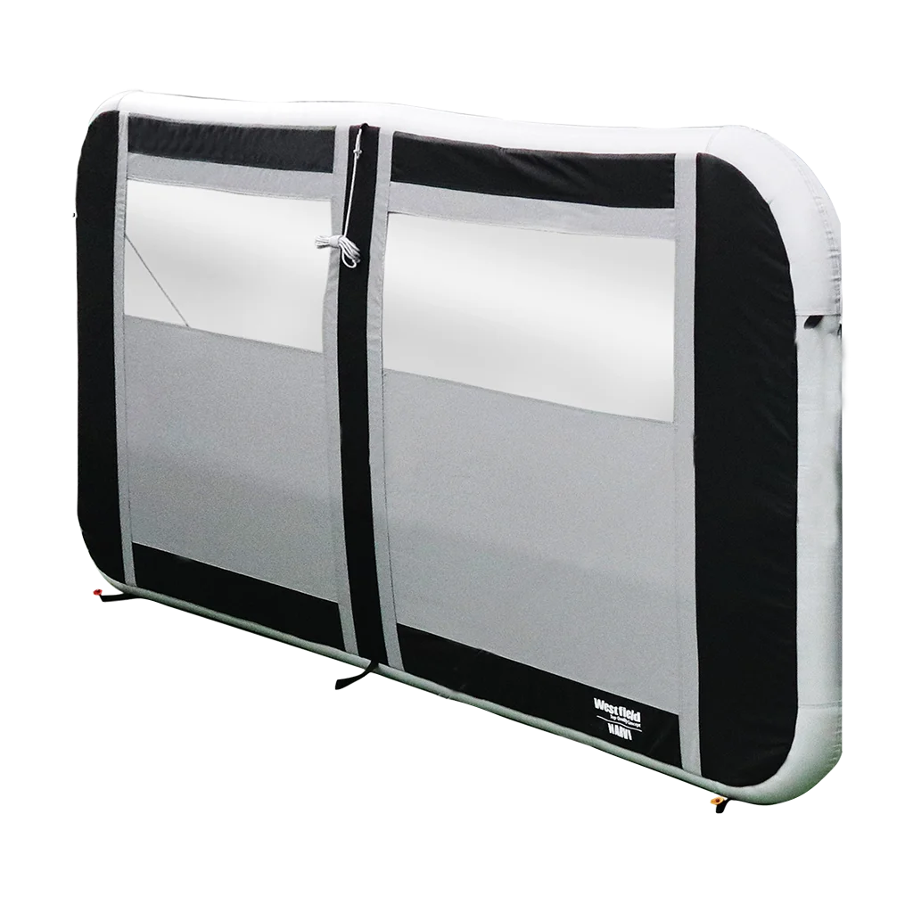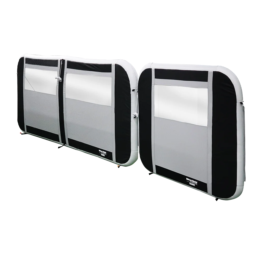This is the Westfield Outdoors premium lite air windbreak system called the NArvi. It comes in two and single panel models (this is the two panel model) and features the premium, but lightweight Hydrotech ripstop fabric ensuring a long lifespan and premium performance whilst keeping the weight down. It uses the Advanced air system air beams making it extremely easy to pitch and single inflation and deflation.